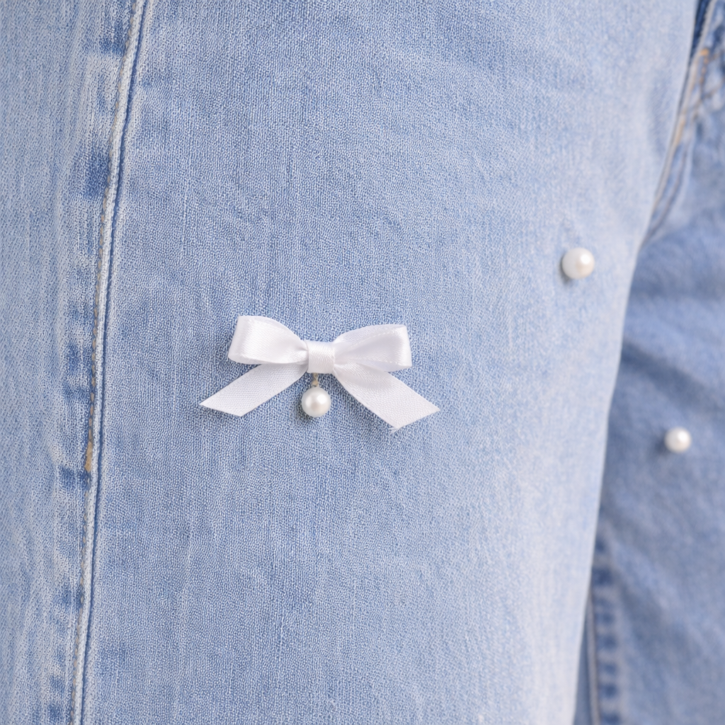 Crafted in a light-wash premium denim, this design features delicate white lace trim along the waistband and front pocket edges, complemented by dainty satin bow appliqués and pearl accents throughout the legs. The relaxed wide-leg silhouette delivers a comfortable drape while maintaining a structured, high-rise fit that flatters the waistline.